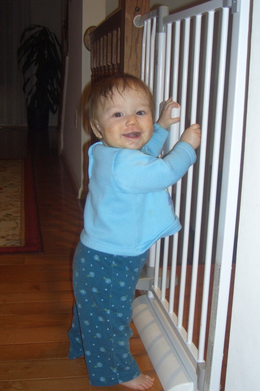 Siena practicing standing up at the gate, just like her sisters.