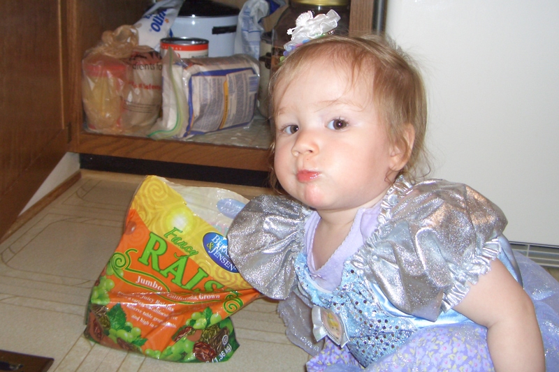 Caught with the raisins again! (And yes, my sisters did dress me.)